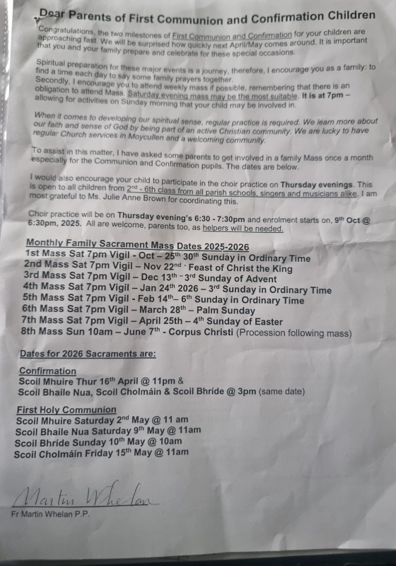 Father Martin has confirmed the dates for the sacraments this year as follows: